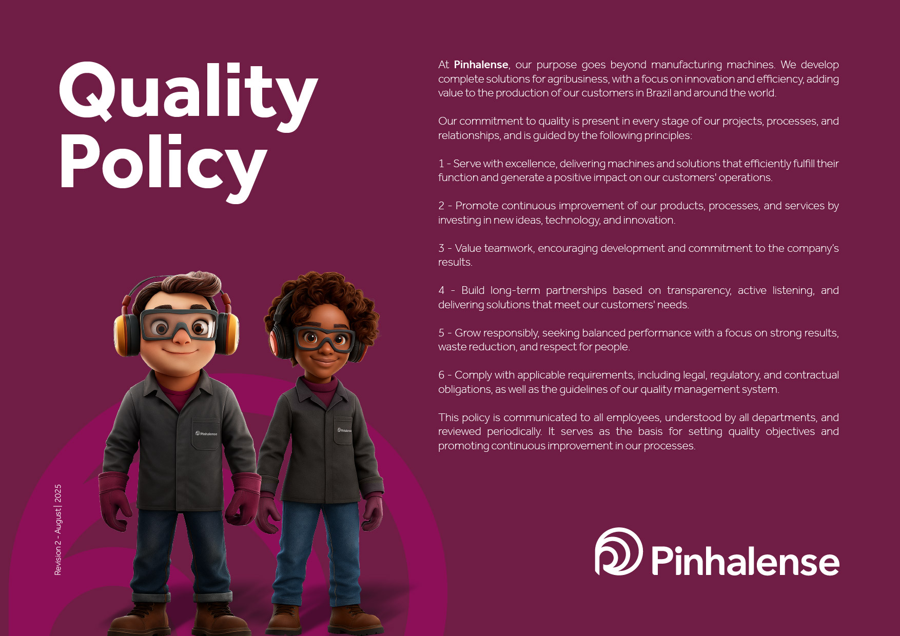 We seek partners who share our commitment to excellence, ensuring products and services that exceed customer expectations. Pinhalense sets strict criteria for the qualification and monitoring of suppliers, ensuring compliance with quality standards and legal requirements. Our partners must be aligned with our pursuit of innovation and customer satisfaction. Together, we deliver reliable, high-impact solutions for the global agribusiness.